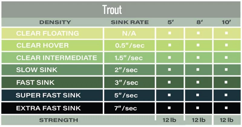 | Modell | 8' Fast Sink – PFS8-8T, 8' Float – PFO-8T, 8' Hover – PH-8T, 8' Intermediate – PI1-8T, 8' Slow Sink – PSS4-8T, 8' Extra S.F.Sink – PESF24-8T, 8' Super F. Sink – PSF16-8T, 5' Extra S.F.Sink – PESF24-5T, 5' Fast Sink – PFS8-5T, 5' Float – PFO-5T, 5' Hover – PH-5T, 5' Intermediate – PI1-5T, 5' Slow Sink – PSS4-5T, 5' Super F. Sink – PSF16-5T |