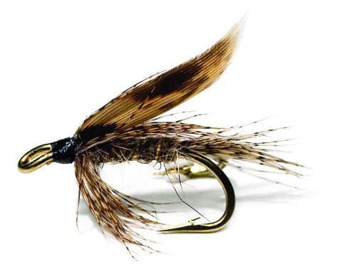 März Braun Grau. Klassische Forellenfliege auf braunem, geöhrtem Mustad-Doppelhaken gebunden.