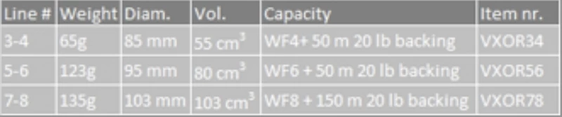 Eine Premium-Rolle braucht eine Weltklasse-Bremse, viel Schnurkapazität, eine leichte, aber dennoch solide Konstruktion und nicht zuletzt ein einzigartiges Design, um sich deutlich von allen anderen Rollen auf dem Markt abzuheben. Das waren unsere Hauptziele bei den XO Fliegenrollen.• Große Gartenlaube• Einstellbare Klickbremse bei 3-4• Gedichtete Scheibenbremse bei 5-6 & 7-8• Eingebaute Gegenwaage• SKF LagerfettLinie Durchmesser Volumen Gewicht Kapazität#3-4 85mm 55cm3 65g WF4 + 50m 20lb Backing